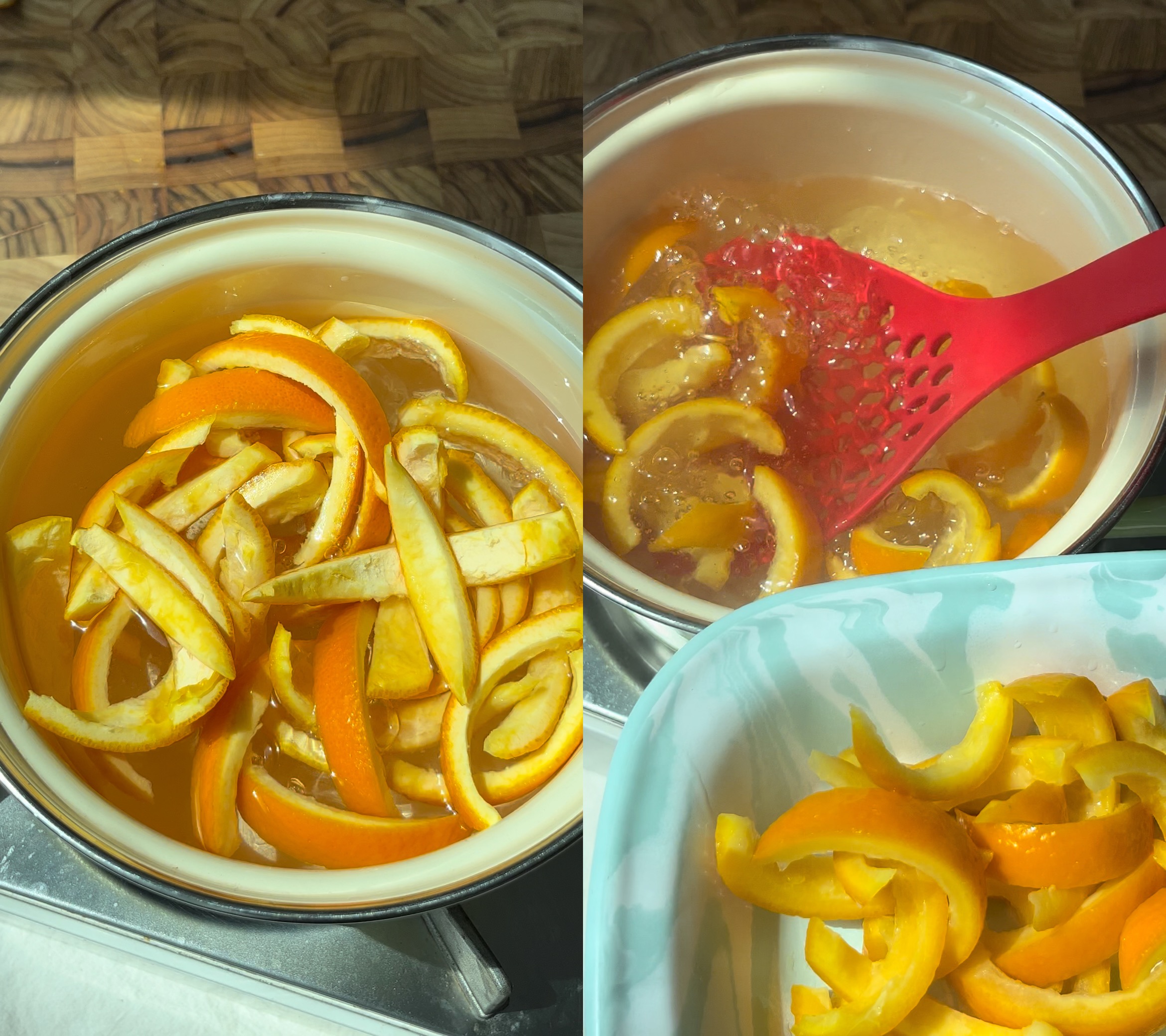 오렌지껍질의 쓴맛 제거를 위해 끓는 물에 5분정도 삶아주세요. 쓴맛이 충분히 제거될거에요:)