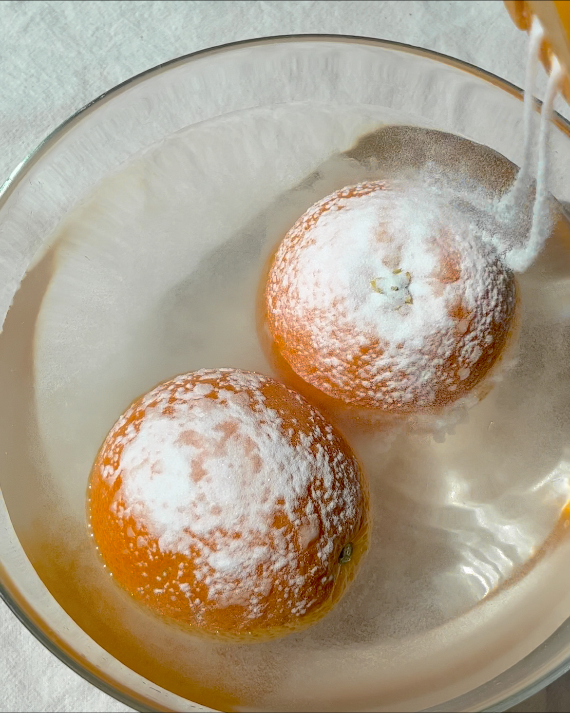 먼저, 오렌지의 껍질에 묻어있는 농약 또는 왁스를 완전히 제거해주기 위해 베이킹소다나 식초로 잘 씻어주세요✨