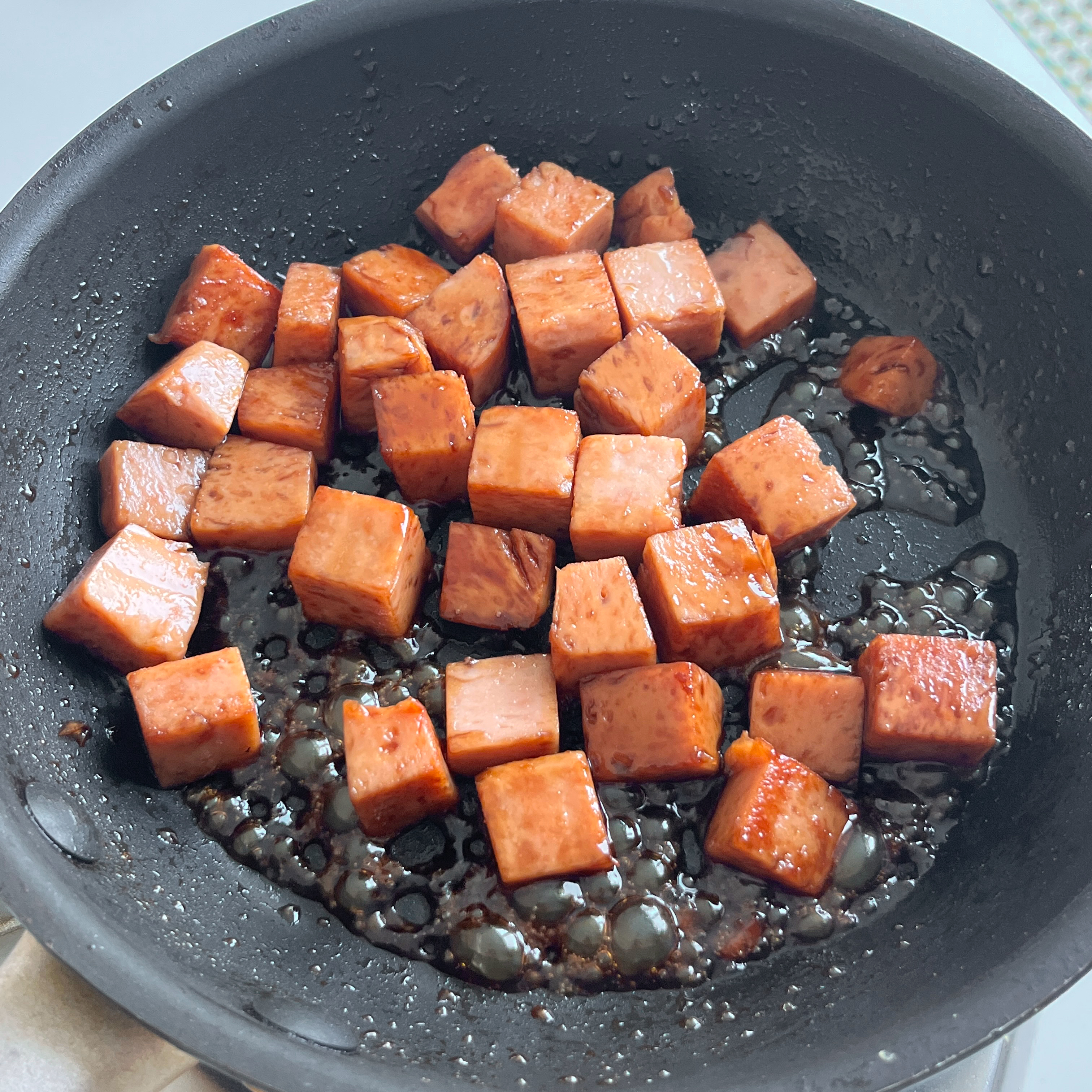스팸은 큐브모양으로 잘라서 노릇노릇 구워주다가