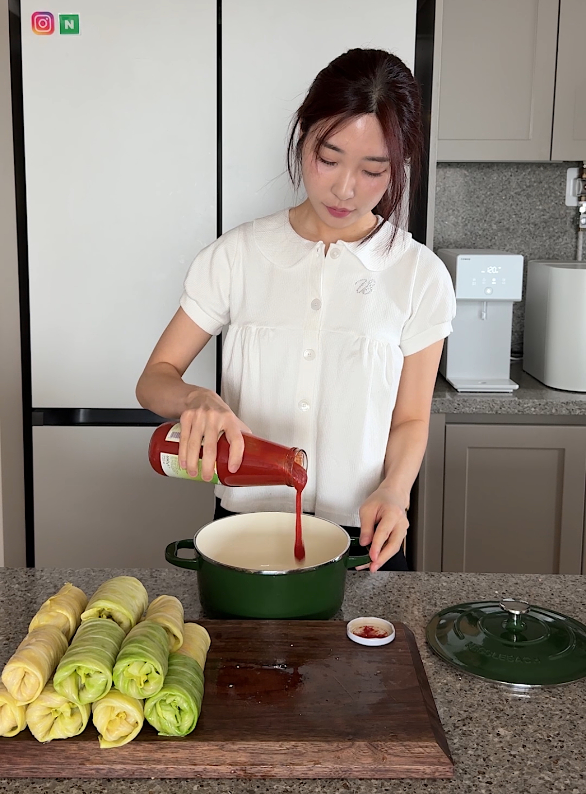 다시 양배추 2단 쌓고, 남은 토마토 소스를 부어주세요.